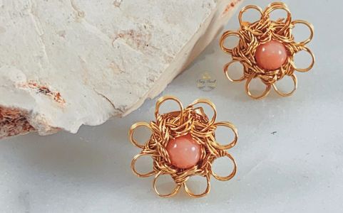Wire Crocheted Earrings in golden colored AAA Copper wires with natural Coral stones (4mm) (1cm circumference)