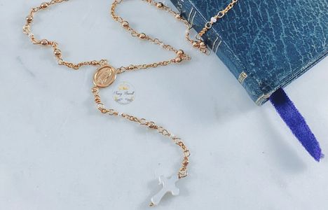 Wire Wrapped beaded Rosary Necklace with golden colored AAA Copper wires, pearl white Miyuki seed beads, gold filled spacers, pearl cross, gold filled chain and gold filled Vigen of Guadalupe medal and closure ( 30cm long )