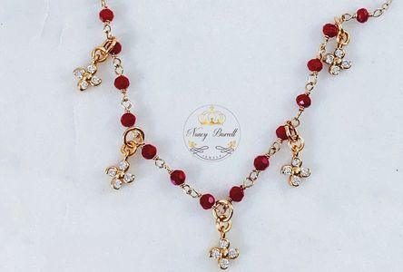 Wire Wrapped Necklace with golden colored AAA Copper wires, red Czech crystals, gold filled chain, charm flowers with crystals and gold filled closure (18.6cm long)